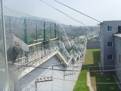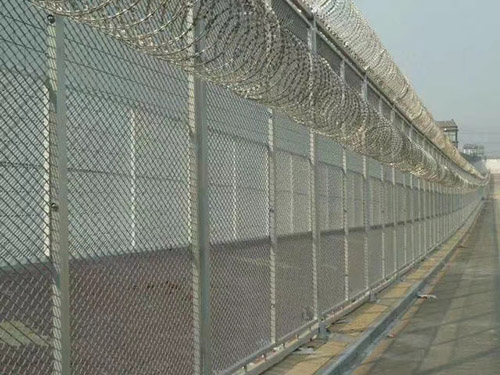 監獄隔離網采用高強度的刀片刺網與普通防護網的結合,由V型支架立拄,加強型焊接片網,安全防盜連接件和刀片刺網組成。由銳利尖角鍍鋅鋼板或不銹鋼薄板做刀片,鋼絲做芯線組合而成。